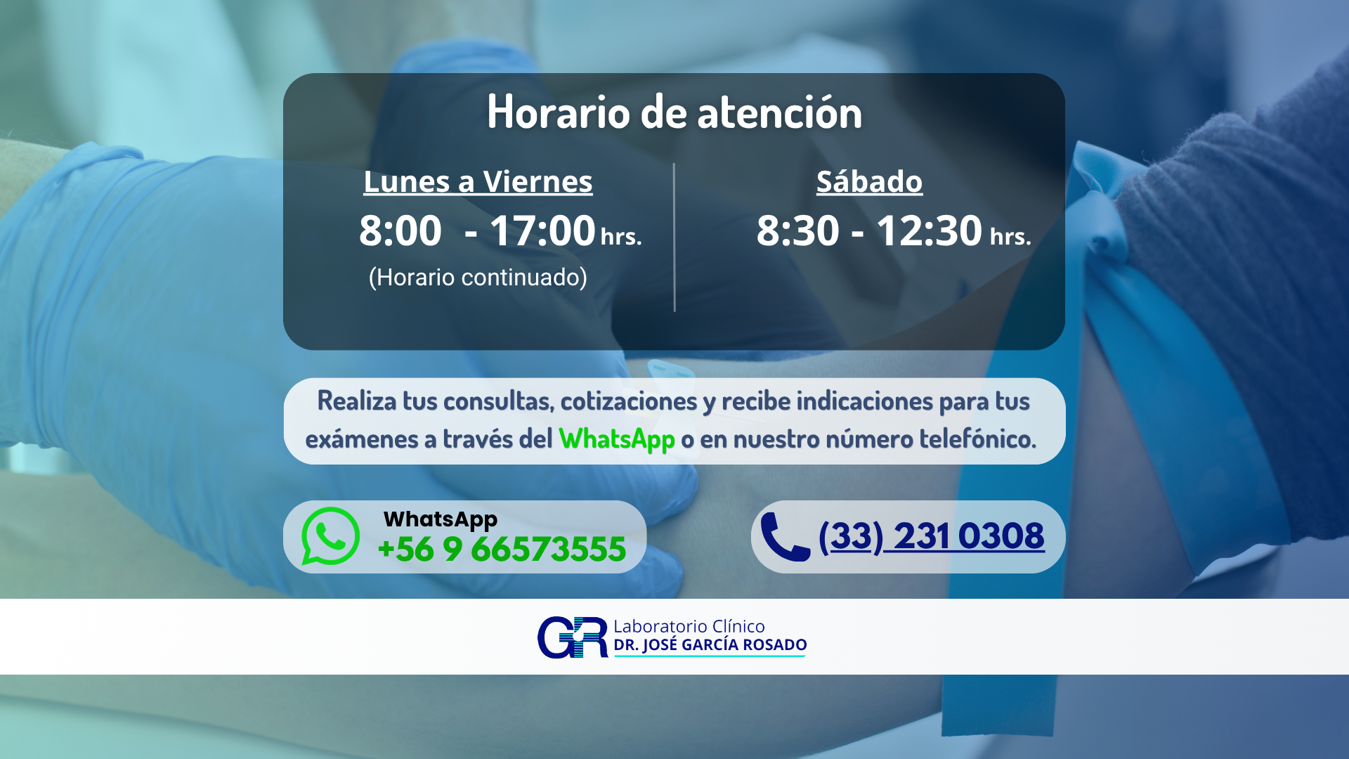 Las tomas de muestras en nuestro laboratorio se realizan por orden de llegada y su horario será desde las 8:00 AM hasta las 10:00 AM para exámenes que requieran ayuno prolongado. Ciertos exámenes como el Cortisol AM se deberán tomar antes de las 9:00 AM, como tambien pacientes con Curvas de Tolerancia, deberán permanecer en el laboratorio por 2 horas. Para poder recibir las indicaciones relacionadas a sus exámenes solicitados, puede acercarse a nuestro laboratorio ubicado en Pudeto 238 en la ciudad de Quillota, así como también por vía telefónica al (33) 2310308 o de forma rápida y sencilla a través de WhatsApp +56 9 66573555 enviándonos una foto de su Orden Medica.